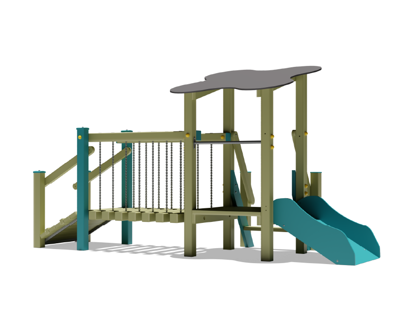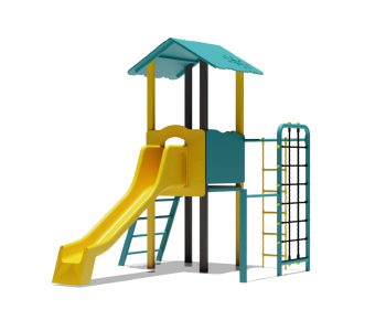 Igralo sadrži: mali toranj s krovom, mali tobogan, most za ravnotežu, kosu ploču za penjanje, stepenice