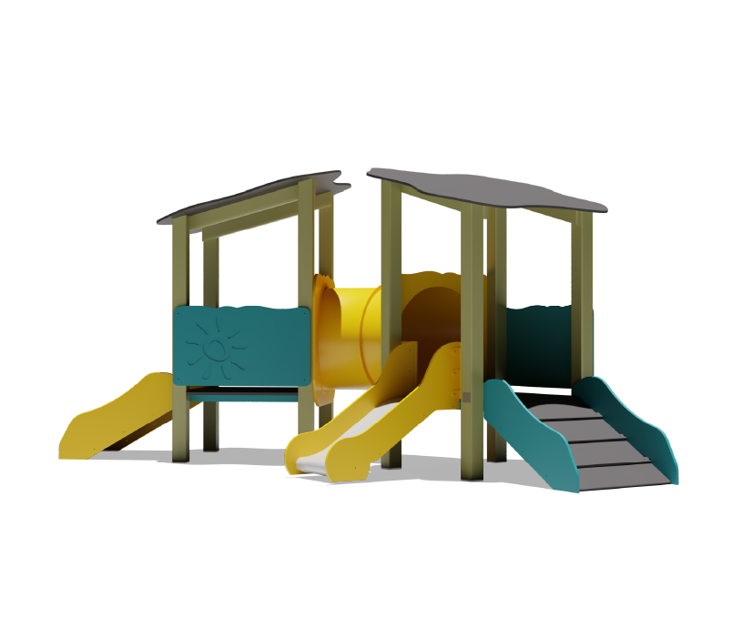 Igralo sadrži: dva mala tornja s krovom, mali tobogan, dvije kose ploče za penjanje, provlačilicu