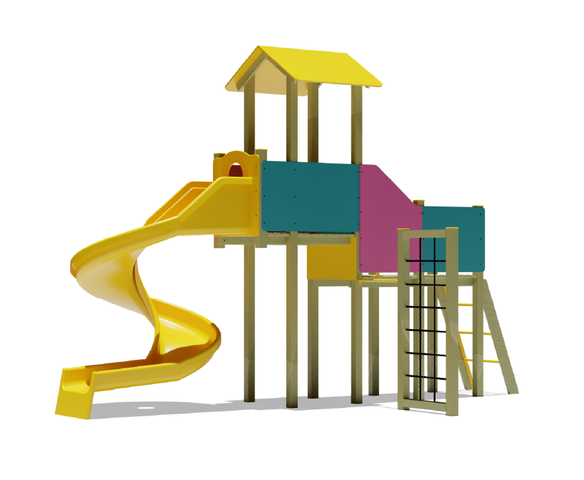 Igralo sadrži: toranj s krovom, toranj bez krova, most, ljestve, mrežu za penjanje, vratilo, spiralni tobogan