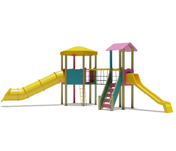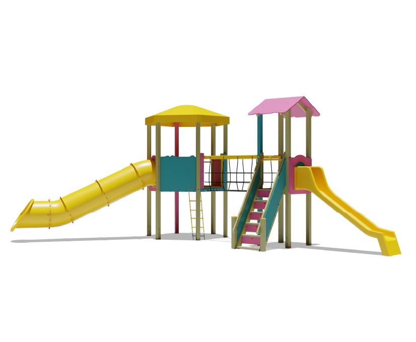 Igralo sadrži: toranj s krovom, šesterokutni toranj s krovom, ravni tobogan, cjevasti tobogan, stepenice s rukohvatom, mornarske ljestve, most od mreže