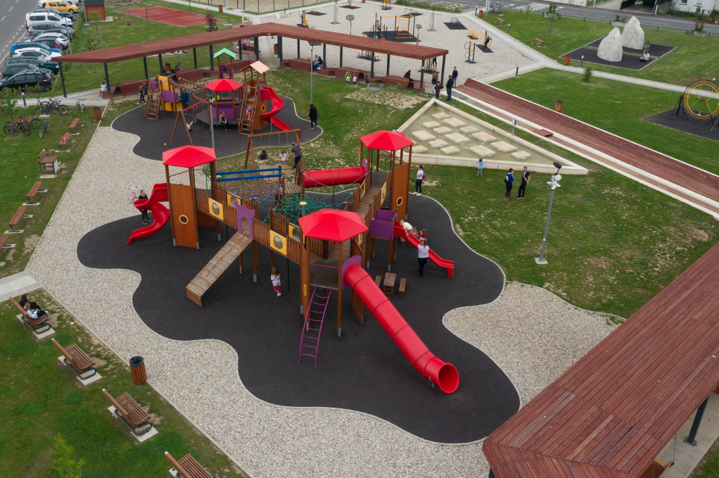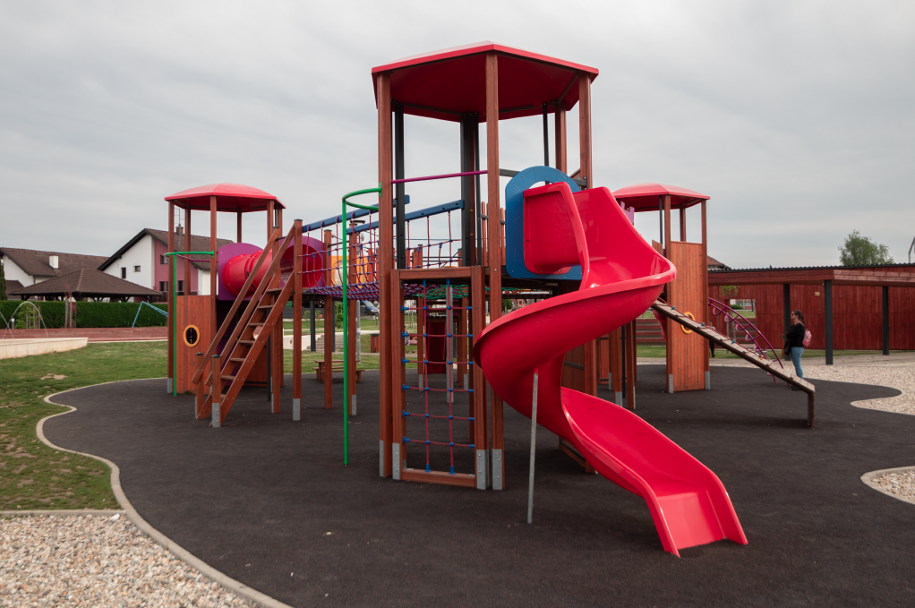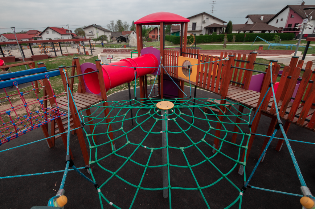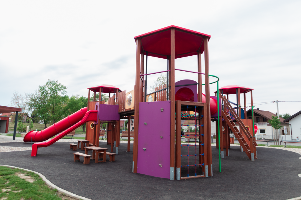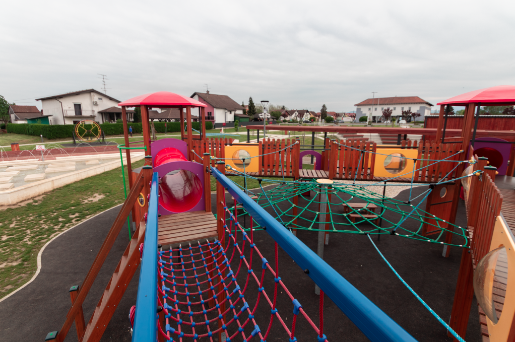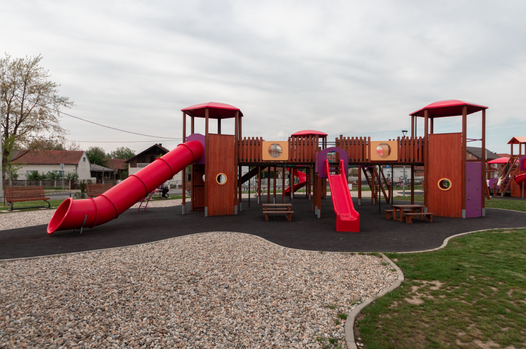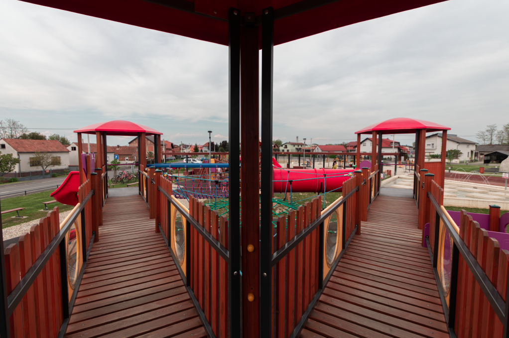 Materijal:  lamelirane drvene grede, aluminijski, drveni i čelični profili, HDPE ploče, tobogani poliester
