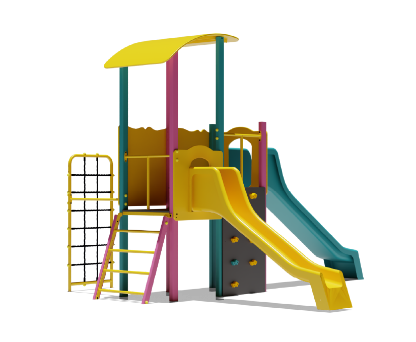 Igralo sadrži: toranj s krovom, toranj bez krova, ploču za penjanje sa gripsovima, dva tobogana, ljestve, vratilo, mreža u okviru