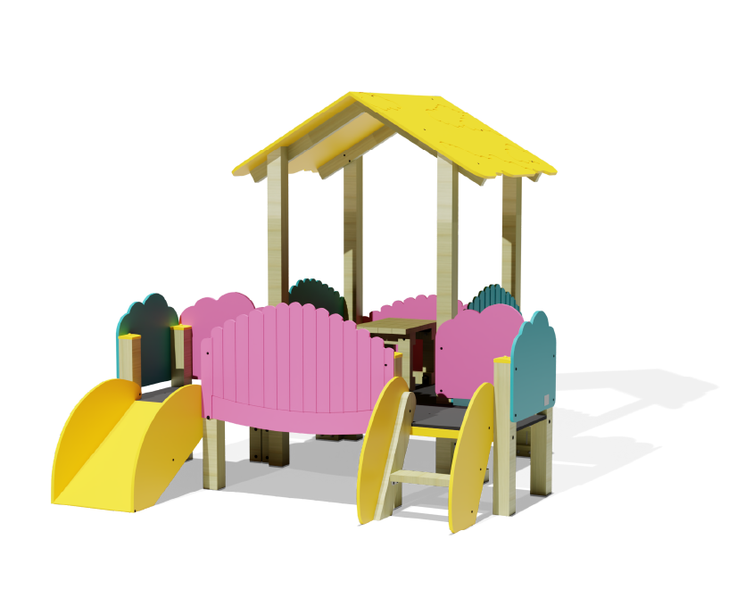 Konstrukcija: izrađena od lameliranog drveta jele i smreke, zaobljenih bridova, zaštićeno procesom dubinske impregnacije Zaštitne ograde, krov i tobogan: izrađene od High Density Polyethylene (polietilen visoke gustoće) Podnica: izrađena od vodootporne protuklizne šperploče Vijčani spojevi: osigurani su sa zaštitnim čepovima kako ne bi došlo do direktnog kontakta i ozljeđivanja pri uporabi opreme. Kućica sadrži: mali toranj s krovom, balkon, mali tobogan, male drvene ljestve, stolić, dvije klupice