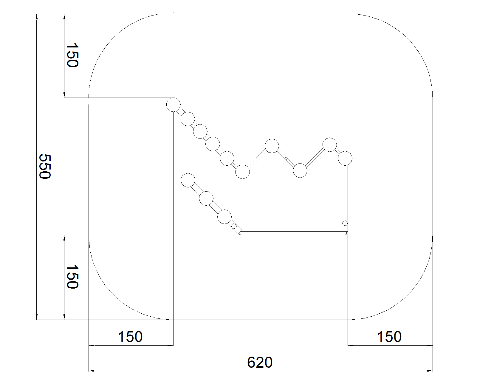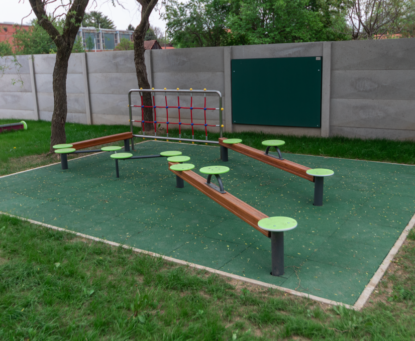 Konstrukcija: izrađena od različitih materijala. Tri grede za održavanje ravnoteže, na kojima se nalaze protu klizni paneli za hodanje, izrađene su od profilirane troslojno lamelirane drvene grede, dim: 100x100mm. Udubljeni profil nalazi se na svakoj strani grede, širine 40mm i dubine 3mm, a koji dodatno stabilizira drveni profil i sprječava pucanje. Jedna greda sa protu kliznim panelima za hodanje izrađena je od metalnih cijevi na nosivim stupićima. Mreža za penjanje nalazi se u okviru od savijenog inox-a. Vijci i spojni materijal od čelika zatvoreni u poliamidna anti-vandal kućišta.