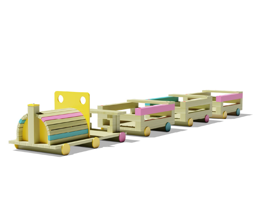 This Stribor express play train consists of a locomotive and three coaches. The locomotive is built from logs, solid wood and wood panels, while the coaches are built from timber and wood panels. The train parts may be partially in natural finish and partially painted in bright colours.