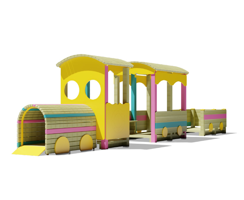 Konstrukcija: izrađena od lameliranog drveta jele i smreke, zaobljenih bridova, zaštićeno procesom dubinske impregnacije Podnice: izrađene su od drvenih letvica jele i smreke Dekorativne ograde i krov: izrađen su od High Density Polyethylene (polietilen visoke gustoće) i drvenih letvica jele i smreke Čelični dijelovi: površinski zaštićeni plastifikacijom Vijčani spojevi: osigurani su sa zaštitnim čepovima kako ne bi došlo do direktnog kontakta i ozljeđivanja pri uporabi opreme. Vlakić sadrži: lokomotivu, vagon sa krovom i dvije klupice, vagon bez krova sa dvije klupice